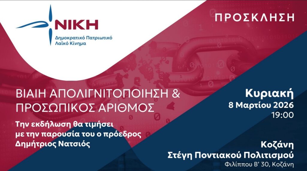 Η ΝΙΚΗ διοργανώνει εκδήλωση στην Κοζάνη, με αντικείμενο δύο ζητήματα κομβικής σημασίας για την κοινωνία, την οικονομία και τη δημοκρατία: τη βίαιη απολιγνιτοποίηση και την καθιέρωση του Προσωπικού Αριθμού.