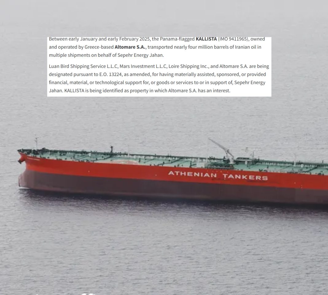 Μάλιστα, το Γραφείο Ελέγχου Ξένων Περιουσιακών Στοιχείων των ΗΠΑ (OFAC) επισημαίνει ότι «από τις αρχές Ιανουαρίου έως τις αρχές Φεβρουαρίου 2025, το δεξαμενόπλοιο KALLISTA (IMO 9411965) με σημαία Παναμά, το οποίο ανήκει και διαχειρίζεται η ελληνική Altomare S.A., μετέφερε σχεδόν τέσσερα εκατομμύρια βαρέλια ιρανικού πετρελαίου σε πολλαπλές αποστολές, για λογαριασμό της Sepehr Energy Jahan». Σχετικά με την τελευταία, σημειώνει επιπλέον ότι «αποτελεί εταιρεία – βιτρίνα που λειτουργεί ως μεταφορέας ιρανικών στρατιωτικών φορτίων πετρελαίου»