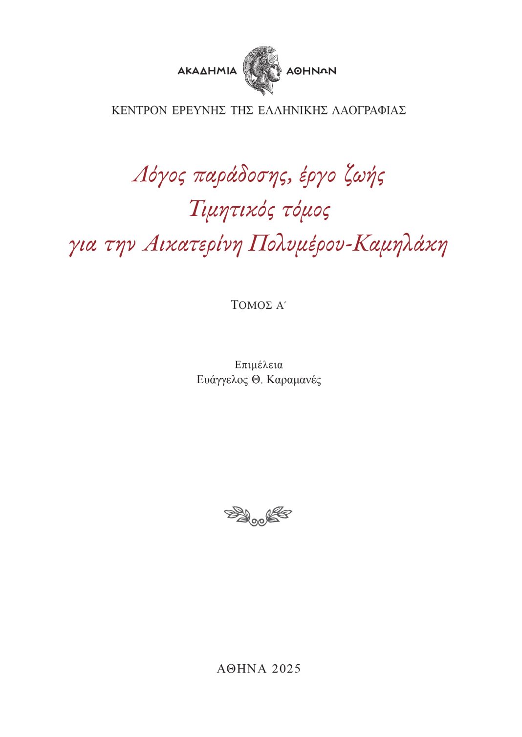 Η δίτομη έκδοση αποτελεί συλλογικό έργο προς τιμήν της Αικατερίνης Πολυμέρου-Καμηλάκη, η οποία υπηρέτησε επί τέσσερις δεκαετίες στο Κέντρο Λαογραφίας της Ακαδημίας Αθηνών, εκ των οποίων τα είκοσι χρόνια ως Διευθύντρια (1993–2013).