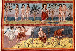 , είναι η Εύα που αφήνεται να δελεαστεί από τον όφη, διαφθείροντας τον Αδάμ και συμβολίζοντας την επιθυμία που θολώνει τη λογική. Η κάτω σκηνή απεικονίζει τη θεία τιμωρία: τον γεωργικό μόχθο για τον Αδάμ και τους πόνους της γέννας για την Εύα, υπογραμμίζοντας τη ζωή της αφιερωμένη στην τεκνοποιία και την ανατροφή. Ο Πλάτων—αν και θεωρούσε κατώτερη επιλογή το να ξαναγεννηθεί κανείς γυναίκα—πίστευε ότι στην ιδανική πόλη οι γυναίκες μπορούσαν να κατέχουν τους ίδιους ρόλους με τους άνδρες, συμπεριλαμβανομένου του εκείνου των φυλάκων.